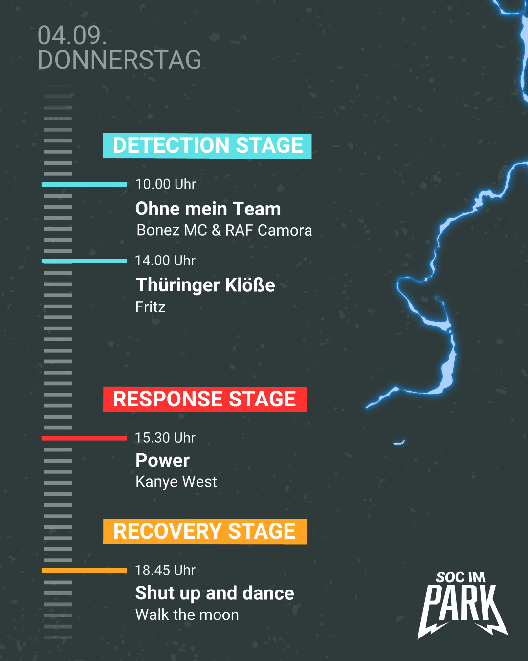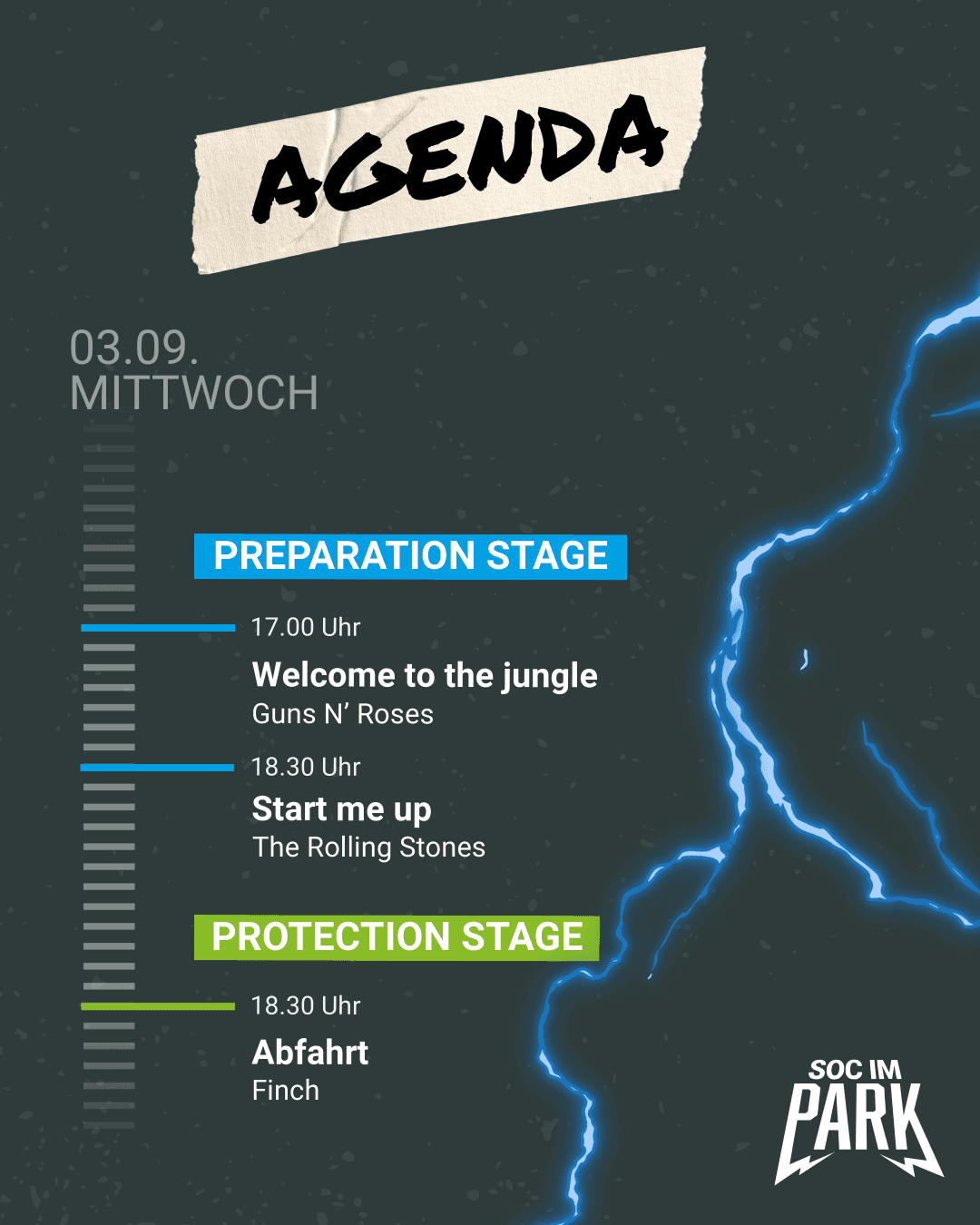 Drei Tage voller Energie, Austausch und Festivalfeeling - das ist SOC IM PARK. Vom ersten Kaffee am Morgen bis zum letzten Song am Abend füllen wir den BORUSSIA-PARK mit Ideen, Gesprächen, Lachen und Momenten, die uns als Team verbinden. Mal laut und energiegeladen, mal leise und persönlich - immer gemeinsam. Damit du jeden Moment mitnehmen kannst, findest du hier den kompletten Ablauf und die Agenda. So weißt du genau, wann die großen Highlights starten, wo spannende Gespräche stattfinden und wann es Zeit ist, einfach die Musik, das Miteinander und das Festivalfeeling zu genießen.